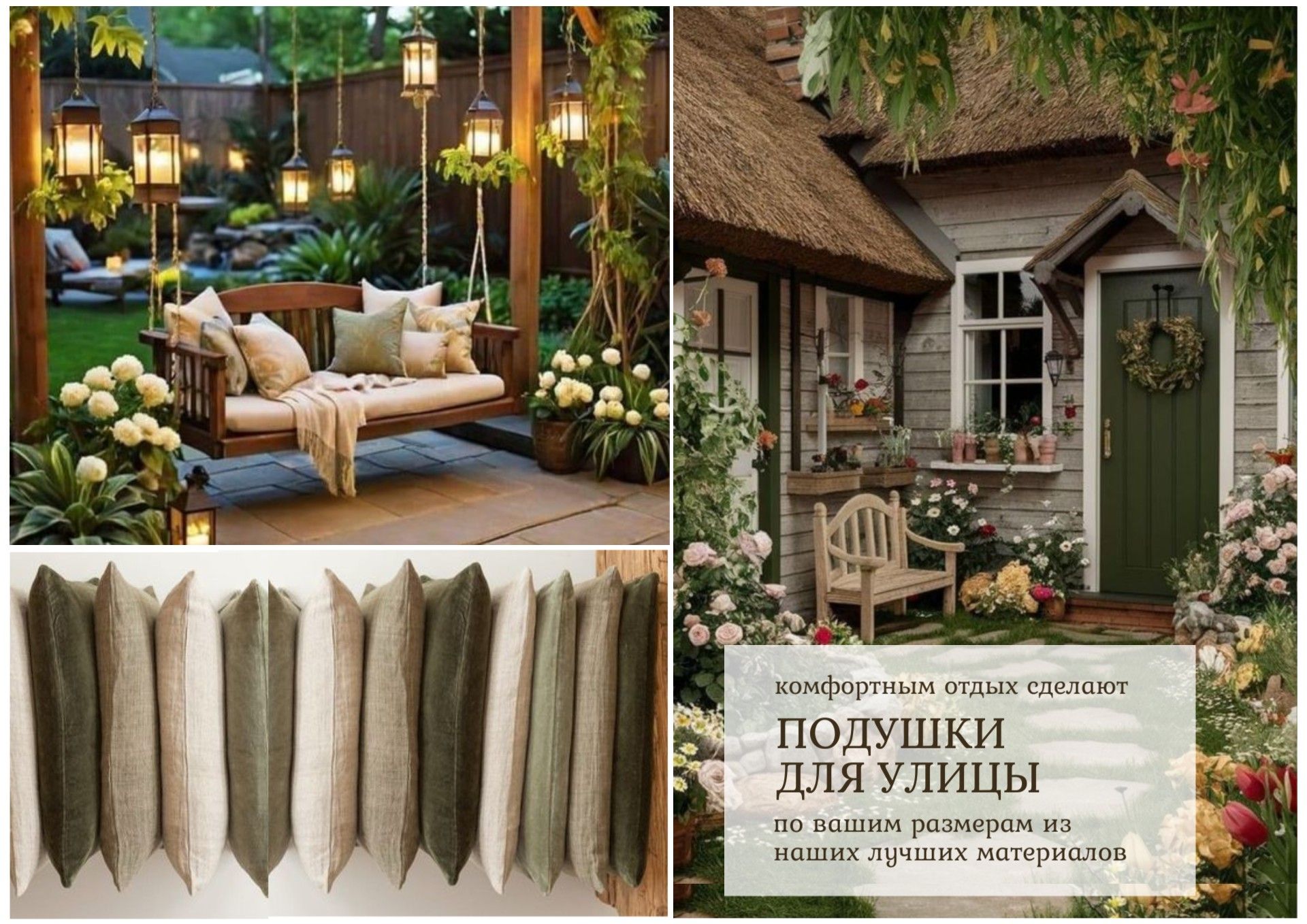 Сейчас мы уже готовы похвастаться большим спектром работ в наших материалах: подушки для садовой мебели и лежаков, качели, беседки, портьеры на террасах, оформление пляжных зон и зон у бассейна, а также многое другое.